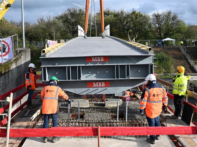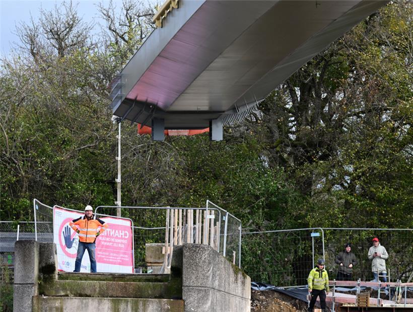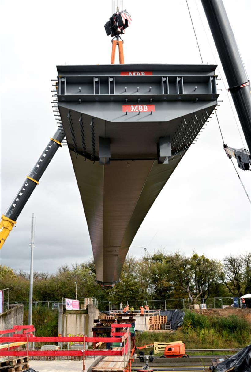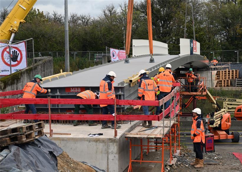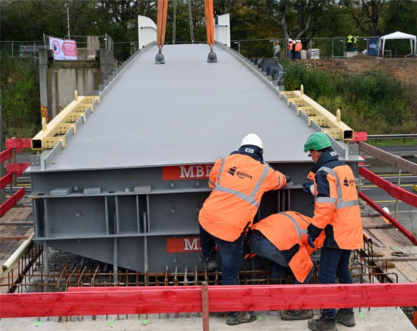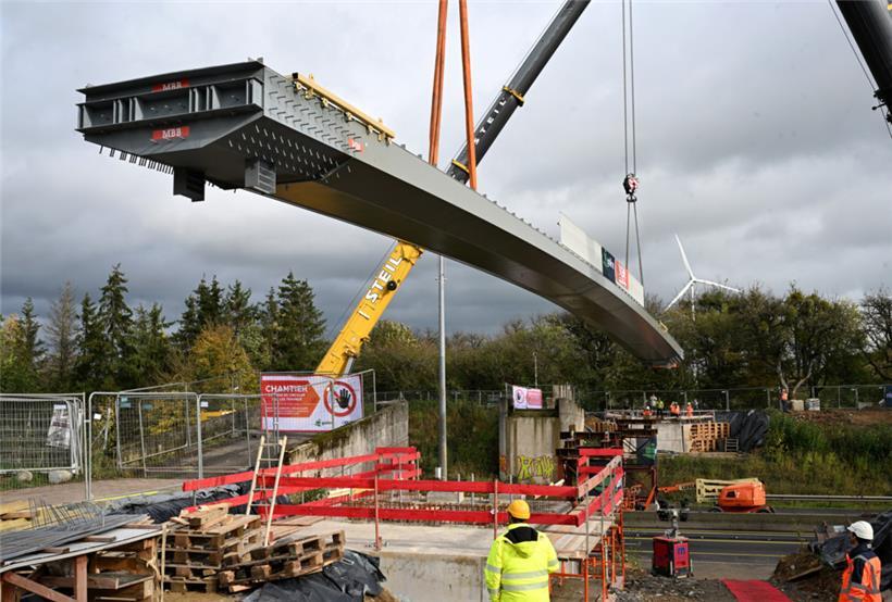 Am Samstag wurde die neue Fußgängerbrücke über der A3 in Bettemburg errichtet. Dafür musste die Straßenbauverwaltung schwere Geschütze auffahren: Zwei Kräne hoben die 100 Tonnen schwere Metallkonstruktion über die Straße. Während der Arbeiten war die Autobahn für den Verkehr geschlossen. Am Vormittag war zunächst die alte Passerelle demontiert worden. Die Brücke verbindet das Wohnviertel in der rue John Fitzgerald Kennedy mit der Straße, die am Fußballplatz des SC Bettembourg vorbeiführt. Begehbar wird die Brücke allerdings erst im Frühjahr sein.