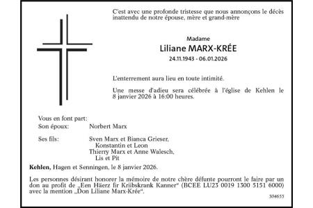 Avis mortuaire Madame Liliane MARX-KRÉE
