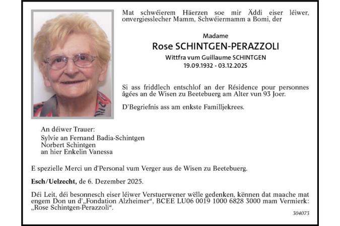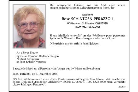 Avis mortuaire Madame Rose Schintgen-Perazzoli