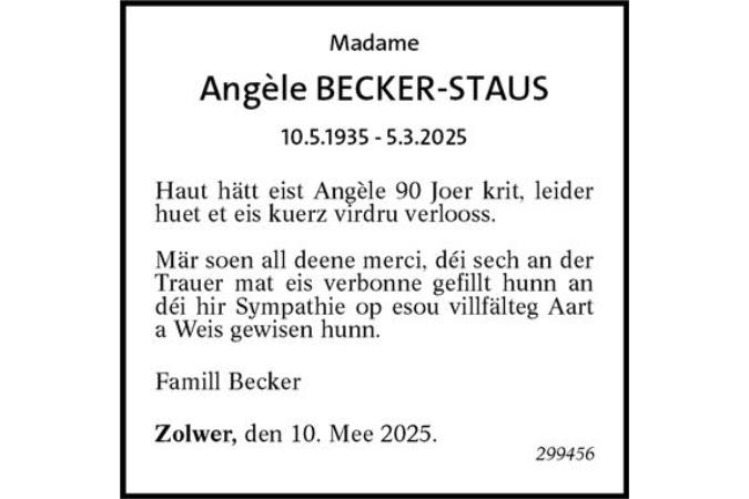 Haut hätt eist Angèle 90 Joer krit, leider huet et eis kuerz virdru verlooss.Mär soen all deene merci, déi sech an der Trauer mat eis verbonne gefillt hunn an déi hir Sympathie op esou villfälteg Aart a Weis gewisen hunn.