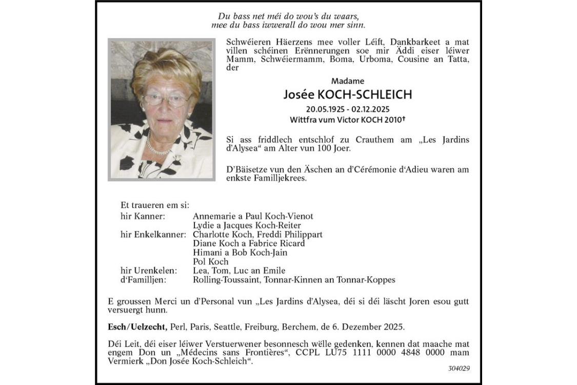 Avis mortuaire Madame Josée Koch-Schleich