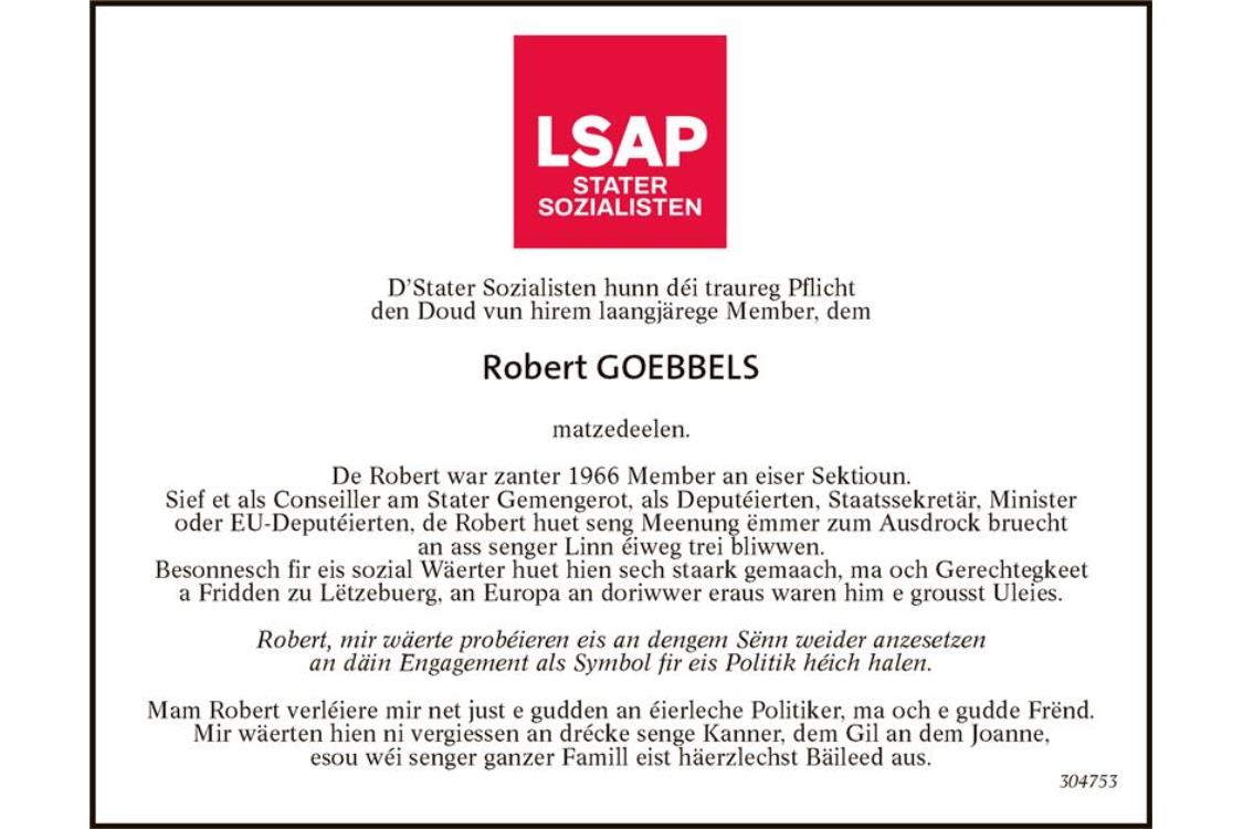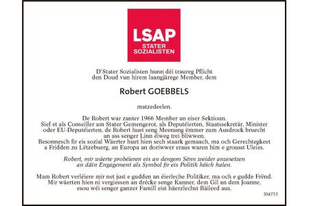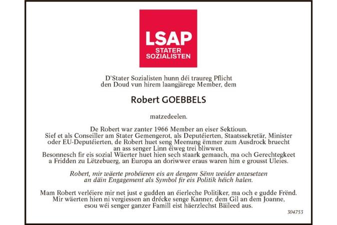 matzedeelen.De Robert war zanter 1966 Member an eiser Sektioun.Sief et als Conseiller am Stater Gemengerot, als Deputéierten, Staatssekretär, Ministeroder EU-Deputéierten, de Robert huet seng Meenung ëmmer zum Ausdrock bruechtan ass senger Linn éiweg trei bliwwen.Besonnesch fir eis sozial Wäerter huet hien sech staark gemaach, ma och Gerechtegkeeta Fridden zu Lëtzebuerg, an Europa an doriwwer eraus waren him e grousst Uleies. Robert, mir wäerte probéieren eis an dengem Sënn weider anzesetzen an däin Engagement als Symbol fir eis Politik héich halen. Mam Robert verléiere mir net just e gudden an éierleche Politiker, ma och e gudde Frënd.Mir wäerten hien ni vergiessen an drécke senge Kanner, dem Gil an dem Joanne,esou wéi senger ganzer Famill eist häerzlechst Bäileed aus. 304753