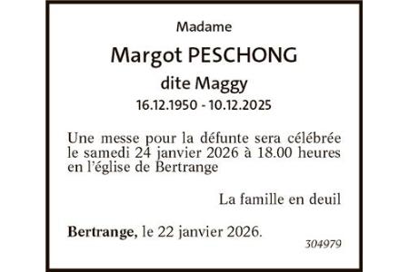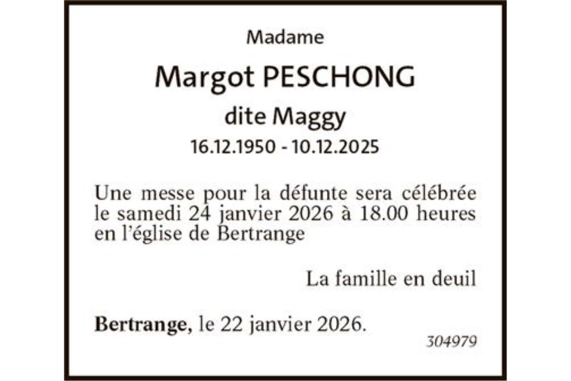 Une messe pour la défunte sera célébrée le samedi 24 janvier 2026 à 18.00 heures en l’église de Bertrange