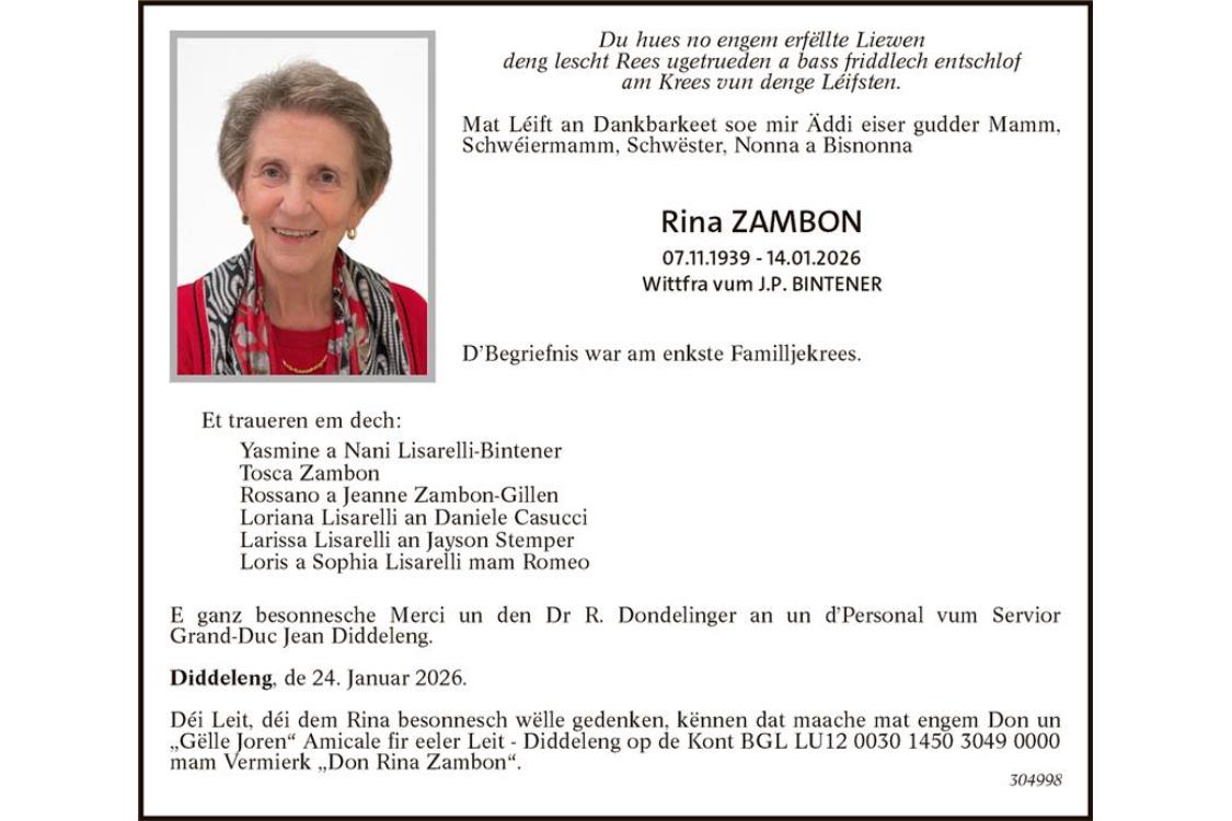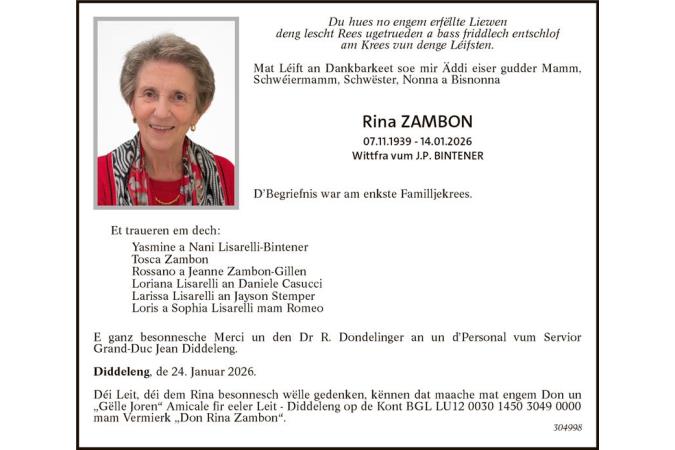 Avis mortuaire Madame Rina Zambon
