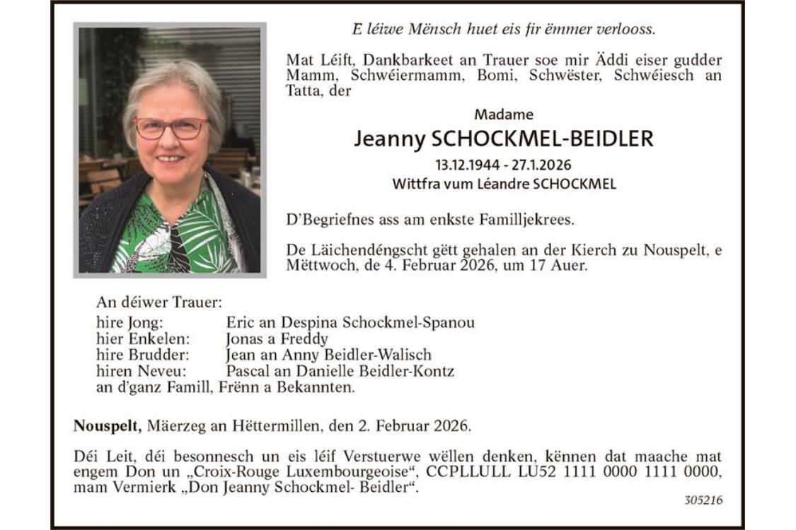 Avis mortuaire Madame Jeanny Schockmel-Beidler