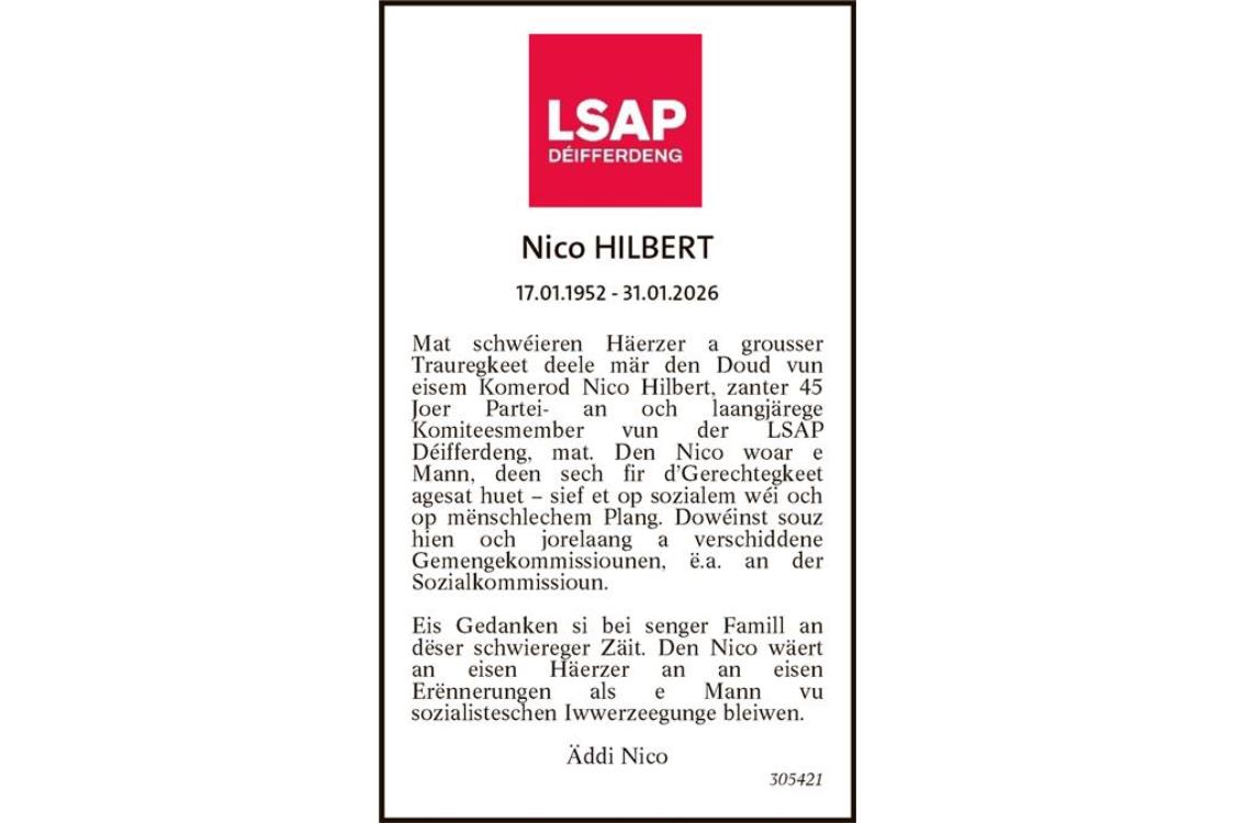 Mat schwéieren Häerzer a grousser Trauregkeet deele mär den Doud vun eisem Komerod Nico Hilbert, zanter 45 Joer Partei- an och laangjärege Komiteesmember vun der LSAP Déifferdeng, mat. Den Nico woar e Mann, deen sech fir d’Gerechtegkeet agesat huet – sief et op sozialem wéi och op mënschlechem Plang. Dowéinst souz hien och jorelaang a verschiddene Gemengekommissiounen, ë.a. an der Sozialkommissioun.Eis Gedanken si bei senger Famill an dëser schwiereger Zäit. Den Nico wäert an eisen Häerzer an an eisen Erënnerungen als e Mann vu sozialisteschen Iwwerzeegunge bleiwen. Äddi Nico 305421