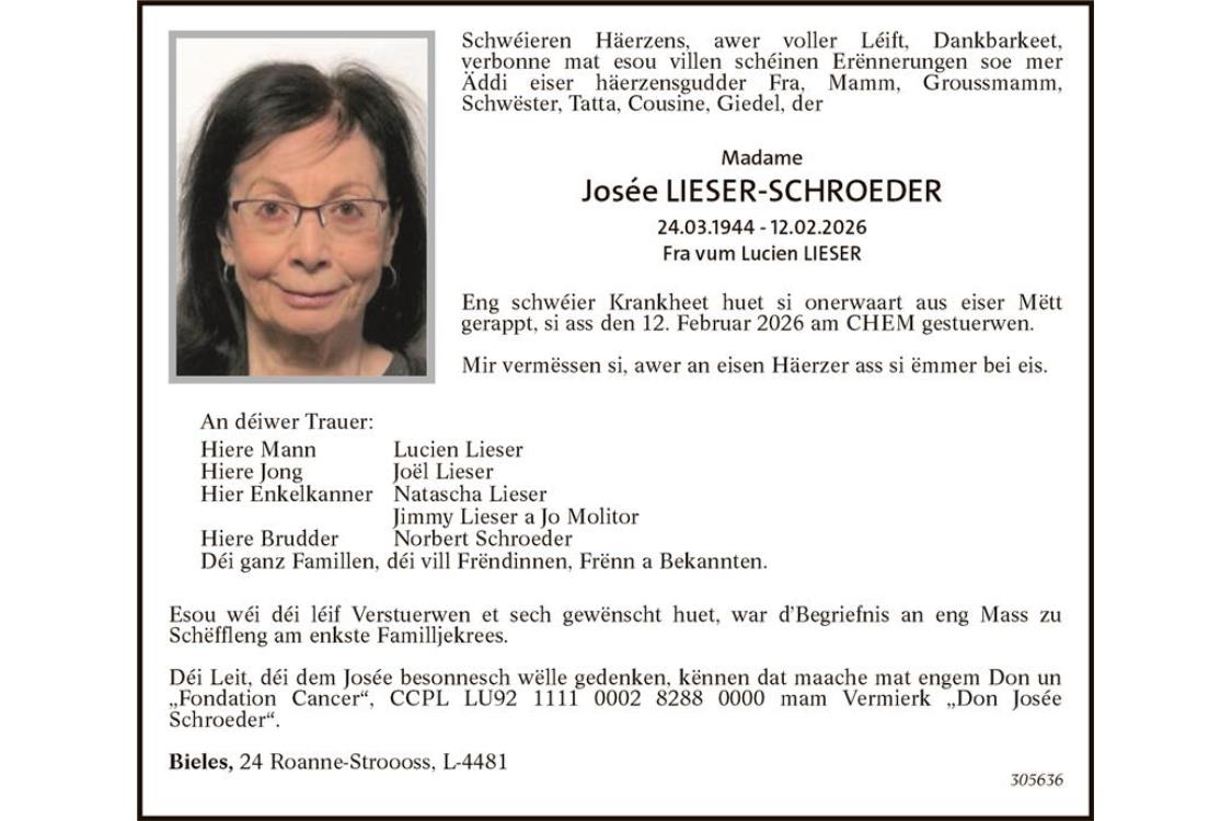 Avis mortuaire Madame Josée Lieser-Schroeder