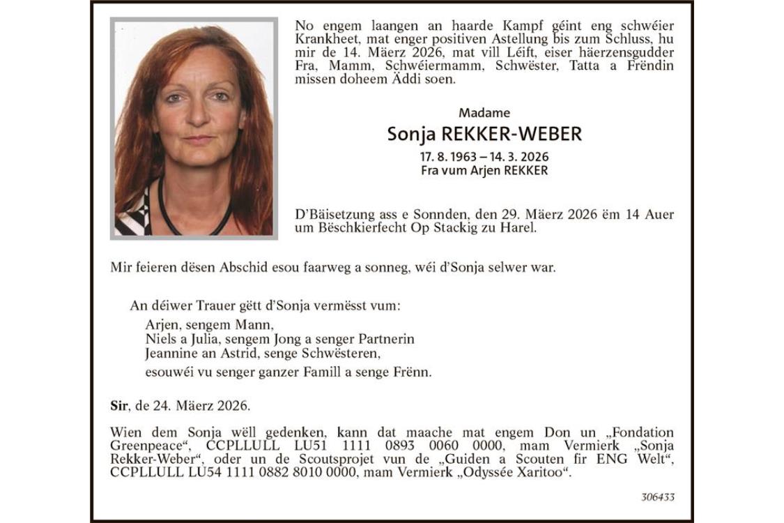 Avis mortuaire Madame Sonja Rekker-Weber