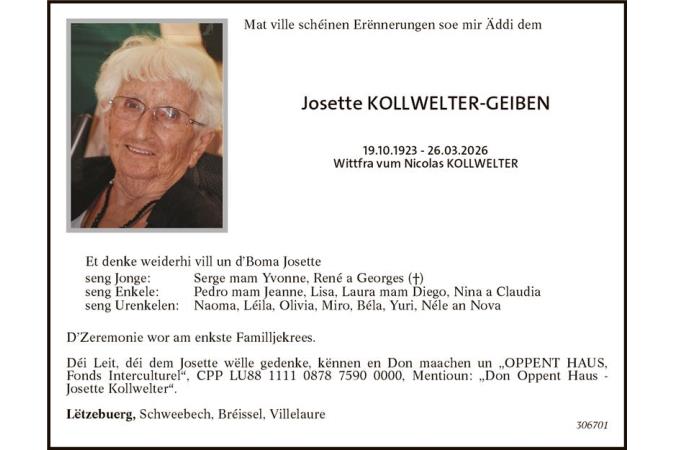 Avis mortuaire Madame Josette Kollwelter-Geiben