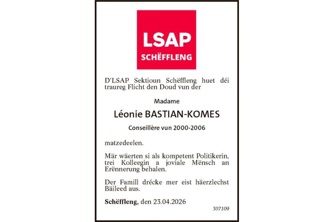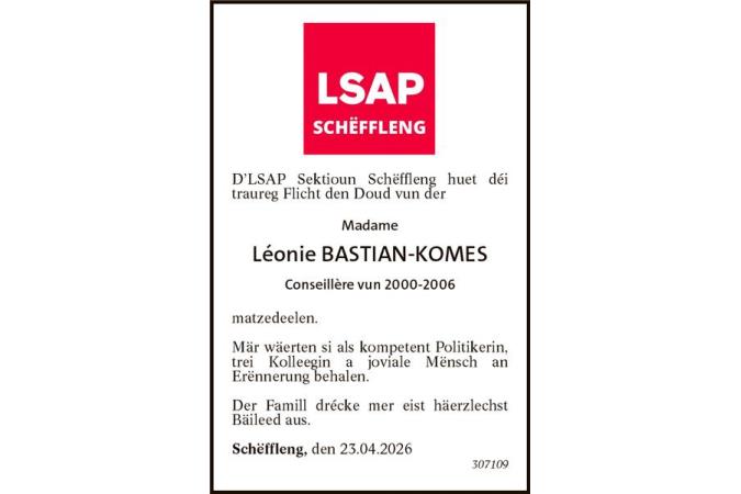matzedeelen.Mär wäerten si als kompetent Politikerin, trei Kolleegin a joviale Mënsch an Erënnerung behalen.Der Famill drécke mer eist häerzlechst Bäileed aus. Schëffleng, den 23.04.2026 307109