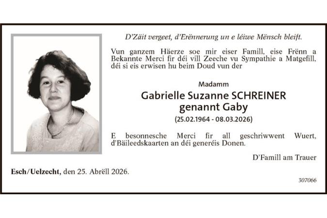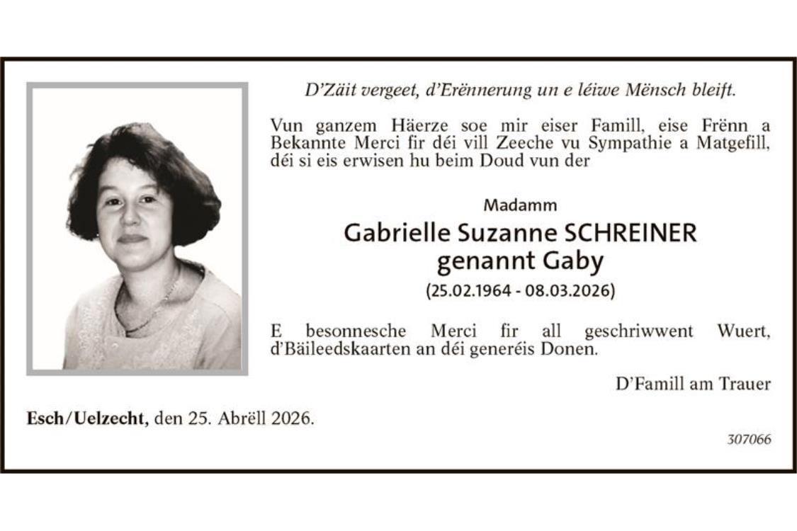 Remerciement Madame Suzanne SCHREINER