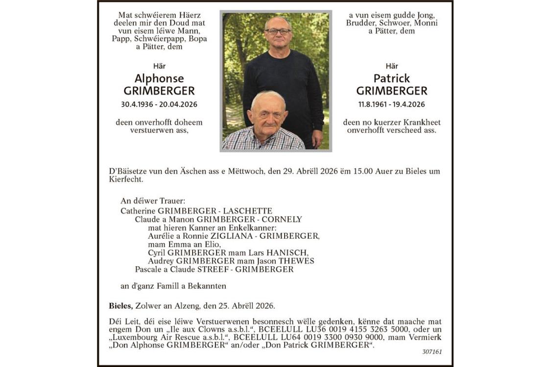 Avis mortuaire Monsieur Alphonse Grimberger et Monsieur Patrick Grimberger