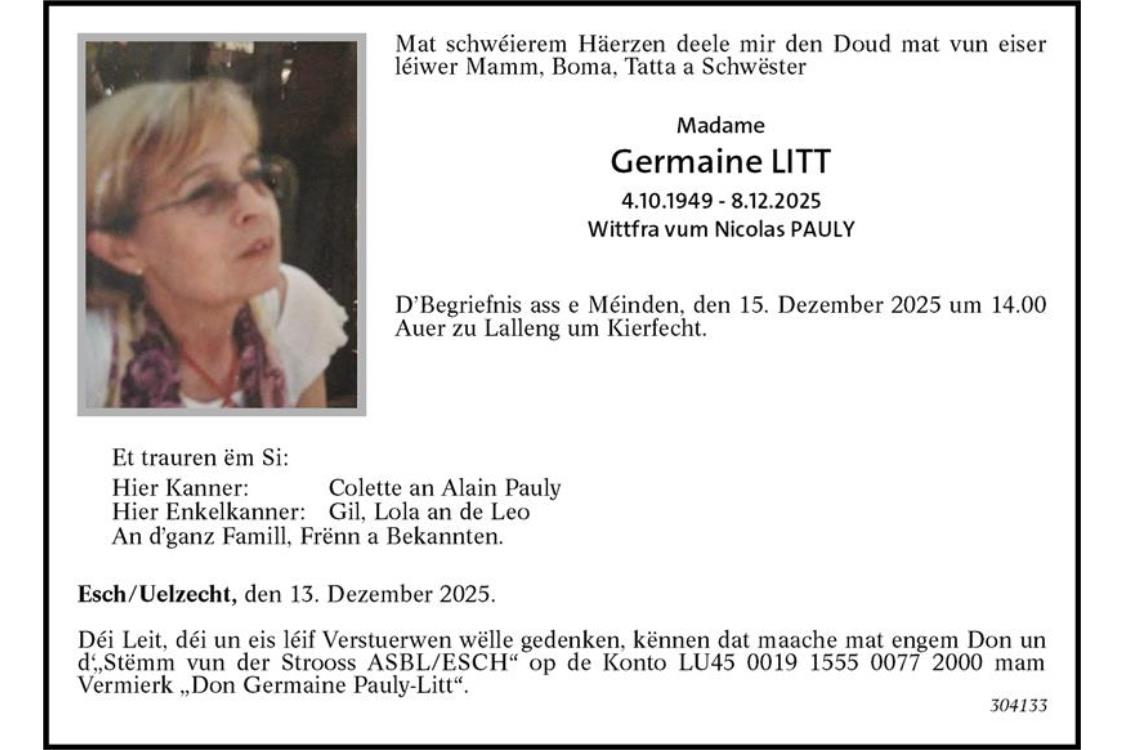Avis mortuaire Madame Germaine Pauly-Litt