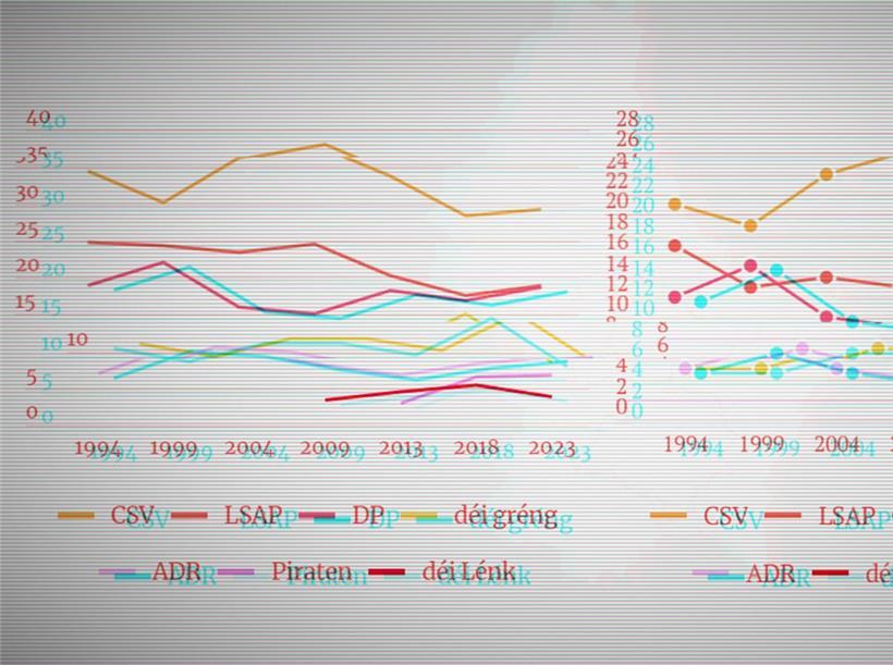 23 Sitze im Süden, 21 im Zentrum, neun im Norden und sieben im Osten. Seit 1989 wird in Luxemburg nach diesem System gewählt. Ein Blick in die Geschichte zeigt: Trends beim Stimmenanteil müssen sich nicht zwangsläufig auf die Zahl der ergatterten Mandate auswirken. Deutlich wird auch, dass die CSV, deren Abstimmungsergebnisse seit 2009 sanken, sich bei den Wahlen 2023 erholen konnte.