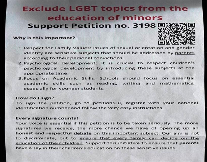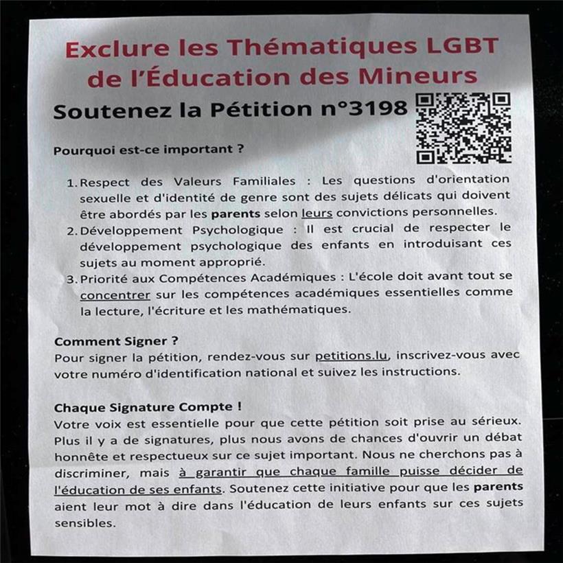 Verschiedene Bewohner aus der Gemeinde Sanem staunten nicht schlecht, als am Mittwoch ein Flyer in ihrem Briefkasten lag, auf dem zu lesen war: „Unterstützen Sie die Petition n°3198“. Diese fordert den „Ausschluss von LGBT-Themen aus der Erziehung von Minderjährigen“.