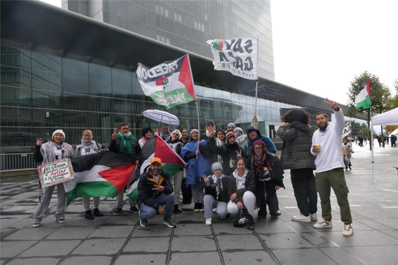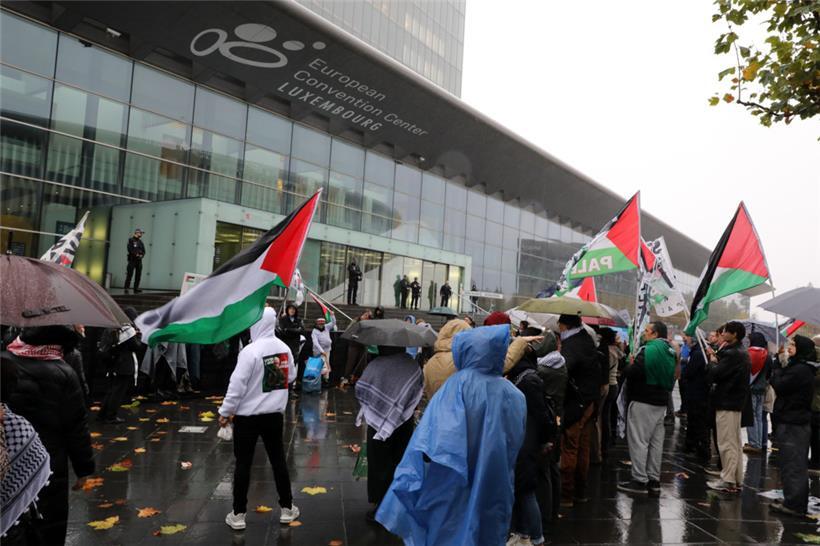 Auf dem regennassen Kirchberg-Plateau vor dem European Convention Center haben sich schon am Morgen mehrere Dutzend Demonstranten versammelt. Sie trotzen dem Regen, um gegen die Israel-Politik der EU zu demonstrieren. An diesem Montag treffen sich die EU-Außenminister in Luxemburg. Auf der Tagesordnung: der Ukrainekrieg und mögliche Maßnahmen der EU gegen Russland, aber auch die Lage im Nahen Osten und die fragile Waffenruhe in Gaza. Während drinnen die Minister beraten, schwenken draußen viele Palästina-Flaggen, mehrere Plakate und Banner fordern Sanktionen gegen Israel. Schon seit dem Wochenende läuft auf der place de l’Europe ein Protestcamp mit Demonstranten aus Luxemburg, Frankreich, der Schweiz, sogar aus Kolumbien.
