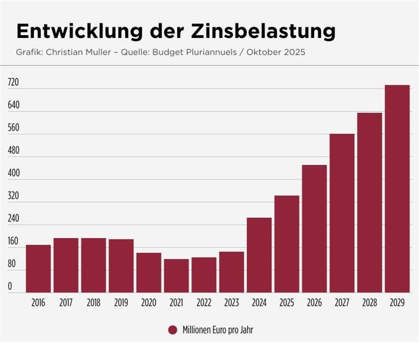 Besonders problematisch entwickelt sich die Zinslast: Die jährlichen Zinsausgaben für die Staatsschulden steigen dramatisch. Hintergrund des Anstiegs sind einerseits die wachsende Summe der Schulden und andererseits steigende Zinsen. Musste der Staat 2021 noch weniger als 120 Millionen Euro an Zinsen zahlen, werden es 2025 bereits 343 Millionen sein und 2029 satte 733 Millionen Euro. Zum Vergleich: Die Zinsen werden den Staat 2029 in etwa gleich viel kosten wie die gesamten Verteidigungsausgaben im Jahr 2025.