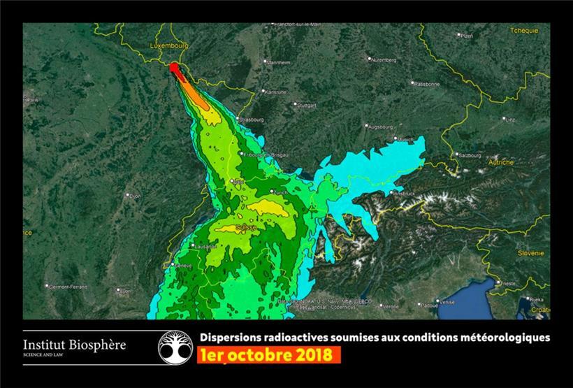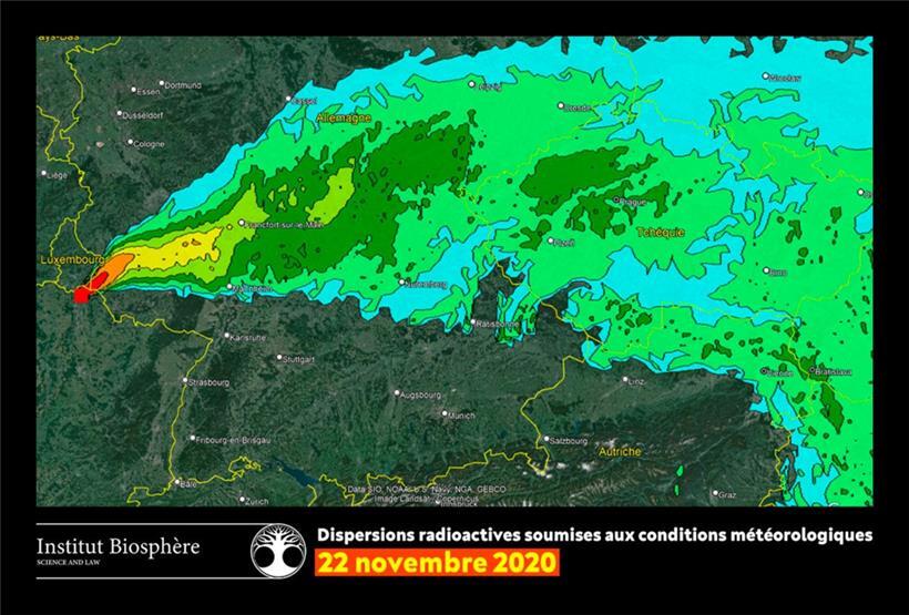 In dieser Modellierung, die einen Zwischenfall im Atomkraft in Cattenom am 14. November 2018 simuliert, wäre Luxemburg laut den Schätzungen stark von Radioaktivität betroffen gewesen Karte: Institut Biosphère/Greenpeace