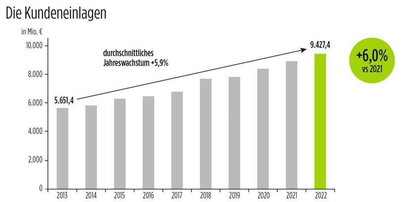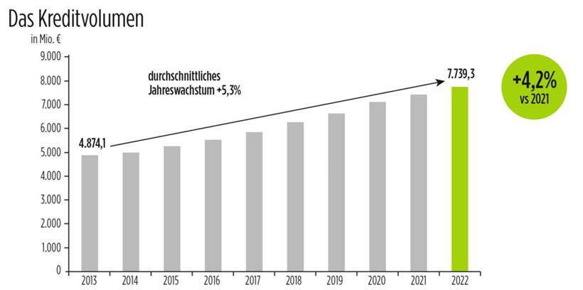 Und diese sind 2022, wie in all den letzten Jahren, deutlich gestiegen. Innerhalb eines Jahres war es ein Plus von sechs Prozent auf 9,4 Milliarden Euro. „Höhere Zinsen haben wieder zur Attraktivität des Sparens beigetragen.“ Das Gesamtvolumen der Kredite sei um „ganz respektable“ 4,2 Prozent (weniger stark als in den Vorjahren) auf 7,7 Milliarden Euro gestiegen.