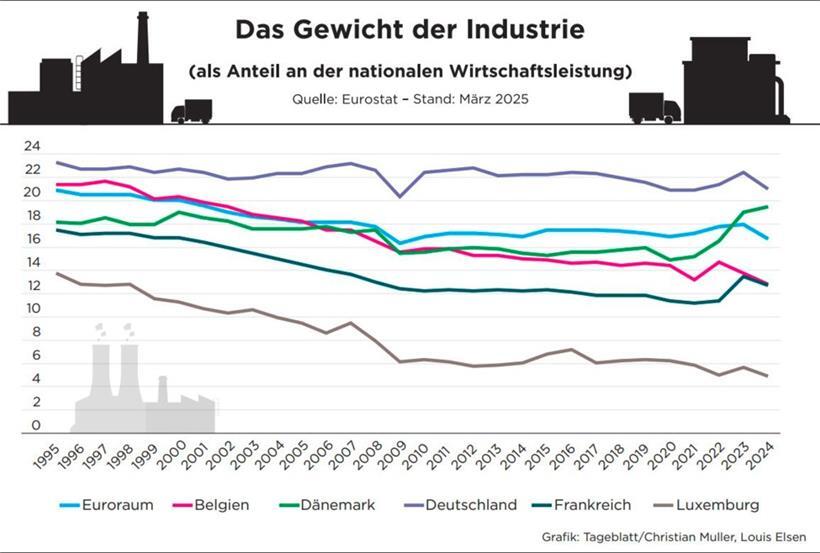 Auch die Folgejahre waren für die Industrie in Luxemburg, wie auch in Europa insgesamt, keine Boomzeit. Im Euro-Raum insgesamt ist der Anteil der Industrie an der Wirtschaftsleistung zwischen 1995 und 2020 von über 20 auf unter 17 Prozent geschrumpft.