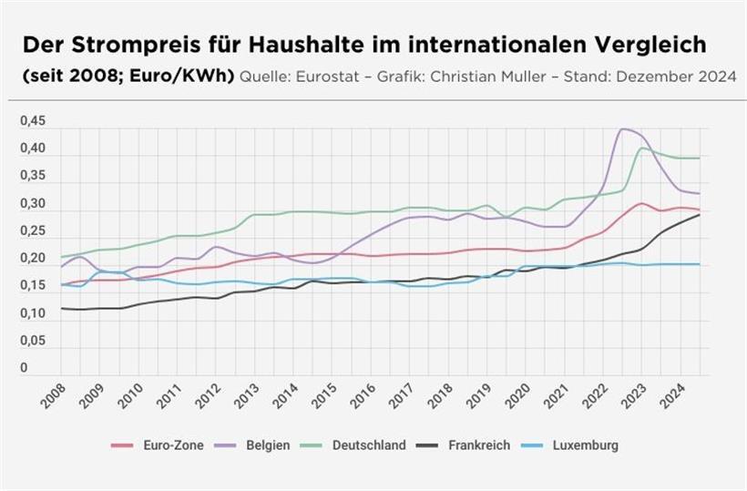 Der Preis, den die Haushalte für Strom zahlen mussten, war derweil 2024, wie bereits 2023, dank der staatlichen Hilfsmaßnahmen, praktisch stabil geblieben. So zahlte der durchschnittliche Luxemburger Haushaltskunde im vergangenen Jahr (mit einem Verbrauch von 4.000 kWh/Jahr) im Schnitt 811 Euro. Das sind 68 Euro pro Monat.