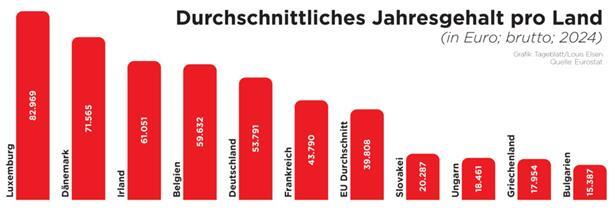 An der Spitze des Rankings hat sich in den letzten Jahren nichts verändert: Das höchste durchschnittliche Brutto-Jahresgehalt wurde demnach, mit 82.969 Euro, auch im Jahr 2024 in Luxemburg gemessen. Mit einem gewissen Abstand folgt, wie in den Jahren zuvor, an zweiter Stelle Dänemark mit einem Jahresgehalt von 71.565 Euro. Auf Rang drei liegt Irland mit 61.051 Euro. Dahinter folgen, mit sehr wenig Abstand, Belgien und Österreich.