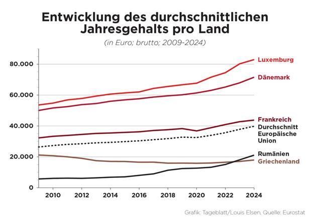 Zuletzt ist Luxemburg jedoch weniger schnell gewachsen: Während die Löhne in der Europäischen Union 2024 im Schnitt leicht mehr als fünf Prozent gestiegen sind, so waren es in Luxemburg letztes Jahr nur 3,4 Prozent. Das ist in etwa gleich wie in Belgien, schwächer als in Deutschland und stärker als in Frankreich. Länder wie Rumänien, Polen und Bulgarien setzten ihre Aufholjagd, mit Zuwächsen von 15 Prozent zum Vorjahr, weiter fort.