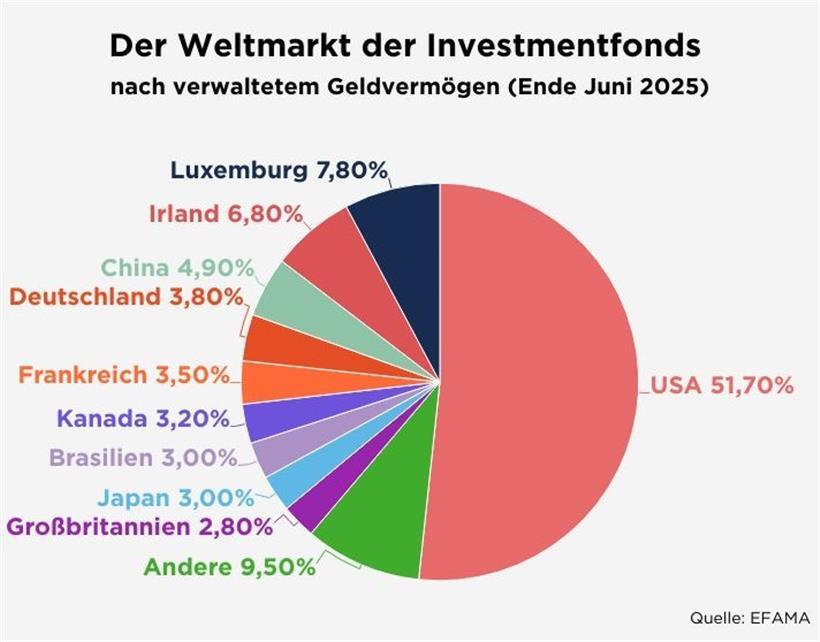 Insgesamt 7,8 Prozent aller Gelder, die weltweit in Fonds angelegt waren, waren Mitte 2025 in Luxemburger Fonds investiert, wie Zahlen vom Branchenverband Efama zeigen. Das ist mehr als in anderen Ländern: China hat 4,9 Prozent Weltmarktanteil, Deutschland 3,8 Prozent und Frankreich 3,5 Prozent.