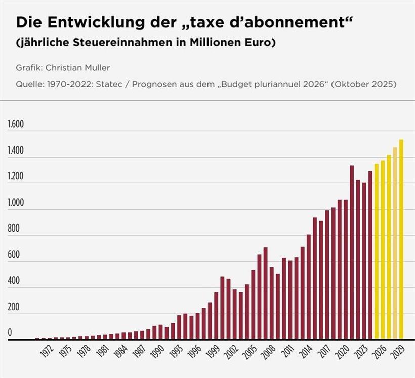 Auch für die Steuereinnahmen ist der Bereich überaus wichtig: Neben den Abgaben auf Gehältern und Gewinnen zahlt die Branche zusätzlich eine Steuer auf dem verwalteten Geldvolumen. Allein im Jahr 2024 hatte diese „Taxe d’abonnement“ einen Rekord von 1,3 Milliarden Euro in die Staatskasse gespült. Seit 2018 handelt es sich um mehr als eine Milliarde Euro pro Jahr. In den kommenden Jahren wird weiter mit Zuwächsen gerechnet: Laut den letzten Prognosen sollen es ab 2029 mehr als 1,5 Milliarden Euro sein.