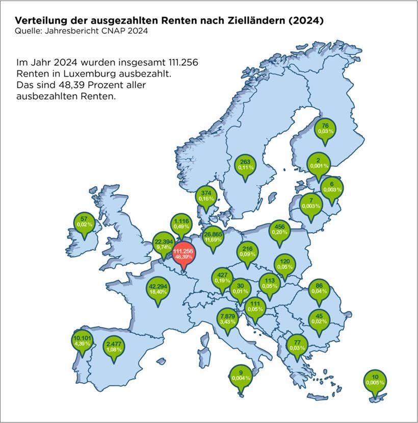 Der größte Teil der 6,8 ausgezahlten Milliarden Euro ist jedoch im Land geblieben. Trotz eines starken Wachstums lag der Anteil der ins Ausland überwiesenen Renten erst bei 33,06 Prozent der gesamten Summe (etwas mehr als 2,25 Milliarden Euro). Erwähnenswert noch, dass Ende 2024 nur 39,2 Prozent der Rentenempfänger über eine ausschließlich luxemburgische Versicherungslaufbahn verfügten.