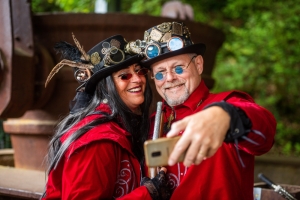 Natürlich waren die Fotografen stark vertreten, bietet das Event doch die ideale Gelegenheit, um originelle Bilder zu schießen. Ein Hingucker waren ohne Zweifel Benoît (57) und Marie-Paule (61) aus dem belgischen Mons. Mit den aufeinander abgestimmten blauen Outfits, dem historischen Kinderwagen mit Dampfmaschine und dem englischen Teeservice zog das Paar viele Blicke auf sich.