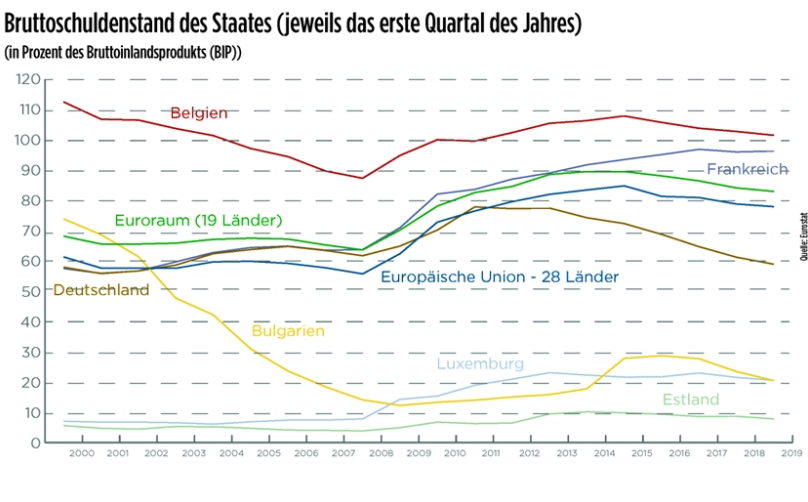 Während vieler Jahre war Luxemburg immer wieder das Land mit der niedrigsten Staatsverschuldung in Europa. Im ersten Quartal des Jahres 2019 ist das Großherzogtum jedoch auf den dritten Platz abgerutscht.