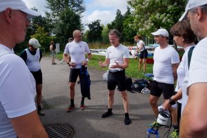 Ehe das Startsignal ertönt, haben wir noch Gelegenheit, bei einer letzten Team- und Renntaktikbesprechung zugegen sein zu dürfen. Der Achter des RV Treviris aus Trier ist von Beginn des Regattareigens in Luxemburg mit am Start und stellt mit fünf Booten und 21 Aktiven das größte Teilnehmerfeld. „Unser Achter ist ausschließlich Ü-50 besetzt“, erzählt uns Steuerfrau Ute Recker-Hamm. „Wir trainieren ganzjährig jeden Sonntag bei Wind und Wetter und nehmen auch an weiteren namhaften Events in London oder Amsterdam teil. Wir bringen schon mächtig Schub aufs Wasser, unser Boot misst 18 m und wiegt mit Crew rund eine Tonne. Wir streben heute eine Zeit um die 22 Minuten an, das wäre unser erklärtes Ziel.“