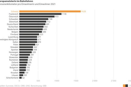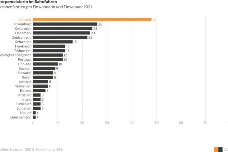 Mit durchschnittlich 1.628 Personenkilometern pro Einwohner war die Schweiz vergangenes Jahr auch bei den zurückgelegten Distanzen im Schienenpersonenverkehr Europameisterin. Hinter der Schweiz folgen Frankreich mit 1.118, Österreich mit 933 und Schweden mit 768 Personenkilometern. In Luxemburg wird mit 471 Personenkilometern eine weniger große Distanz zurückgelegt – das reicht nur für Platz elf.