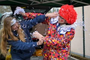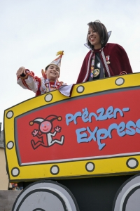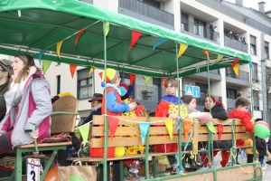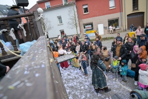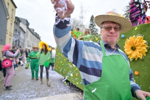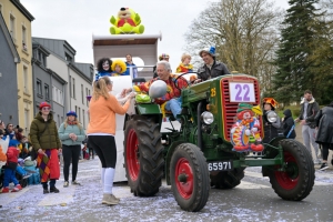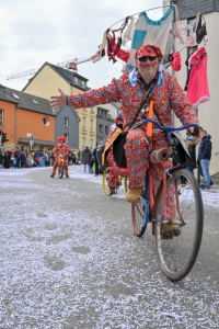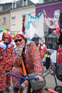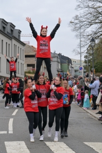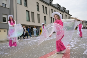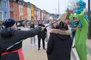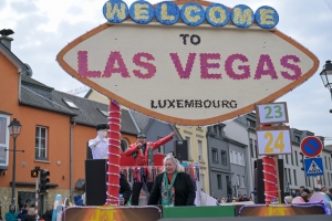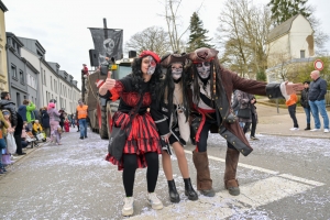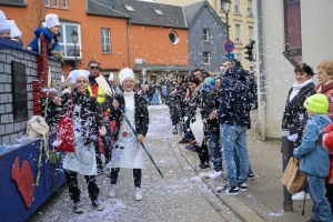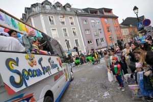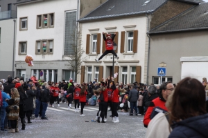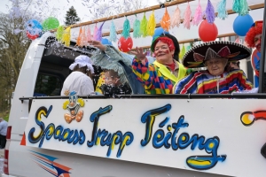 Verkleidete Fußtruppen, Musikgesellschaften und Umzugswagen wie „Spaass-Trupp Téiteng“ und „Black Pearl“ spornten die Menge zur „Kamellen“-Jagd an, während die Turnerinnen und Cheerleader der „Espérance Esch“ ihre gewagten Übungen vortrugen. Aus den Lautsprechern ertönten Karnevalslieder wie „Viva Colonia“. Softdrinks und kulinarische Spezialitäten wurden von den lokalen Vereinen und den umliegenden Gaststätten angeboten.