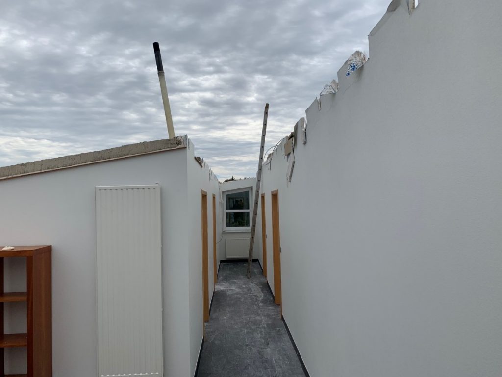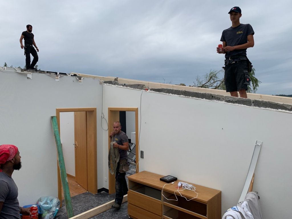 Da es sich hierbei um ein sehr großes Dach handelte, musste die ganze Truppe der beiden Firmen ran. „Wir schufteten zu 16 Mann acht Stunden lang allein an diesem provisorischen Dach. Das war beileibe kein einfaches Unterfangen. Am Rande bemerkt: Ein Mitarbeiter wurde gleich mehrmals von Wespen gestochen. Wir haben vor Ort um Hilfe gebeten, doch es blieb mir nichts anderes übrig, als eine Ambulanz anzufordern“, erzählte uns Jang Schumacher.