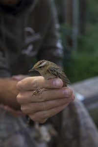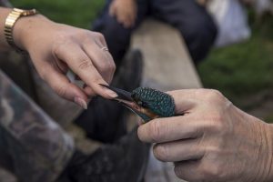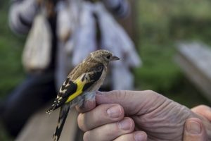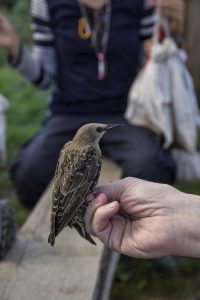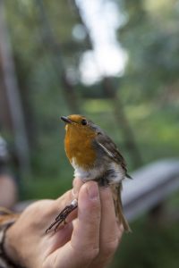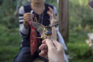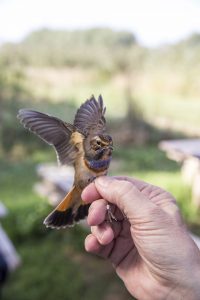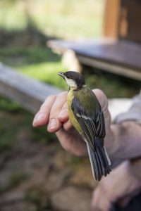 Klein jedenfalls schnappt sich den Piepmatz, als hätte er nie etwas anderes getan. Er hält das Köpfchen zwischen Zeige- und Mittelfinger, im sogenannten „Beringergriff“. Dadurch kann der Vogel atmen, ist aber trotzdem fixiert. Gekonnt dreht er ihn um und legt ihm mit einer Beringerzange einen kleinen Aluminiumring an. Darauf sind eine Nummer und ein Land eingestanzt. „Der Ring ist wie der Ausweis des Vogels, jeder ist einzigartig“, erklärt er. Während Manuel Ewen die gesammelten Daten in den PC eingibt, misst Klein die Flügel und pustet dem Vogel auf den Bauch. Was amüsant aussieht, hat einen Zweck: „Daran kann man die Fettreserven des Tieres erkennen.“ Keine zwei Minuten später wird die Blaumeise wieder in die Freiheit entlassen.