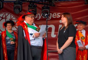 Der Auftakt des Programmreigens am Samstag gehörte der scheidenden Weinkönigin Loredana. Auf der Bühne „Am Moartplaz“ wurde sie, so wie die Tradition dies vorsieht, in die ehrenvolle Bruderschaft „Confrérie St-Cunibert“ aufgenommen.