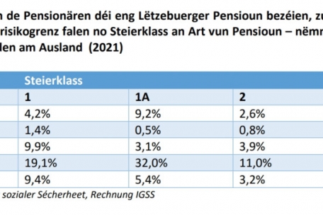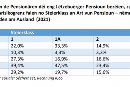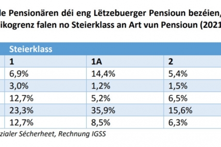 Demnach fielen jene 7,4 Prozent der Rentner, die in Luxemburg wohnen und eine Luxemburger Pension beziehen, 2021 unter die Armutsgrenze. Die meisten davon – 12,7 Prozent aller Rentner – wurden in der Steuerklasse 1 besteuert. Besonders hoch ist der Anteil der Armutsgefährdeten bei denjenigen, die eine Invalidenrente beziehen: Er liegt insgesamt bei 18,9 Prozent; bei Beziehern in der Steuerklasse 1a sogar bei 35,9 Prozent.