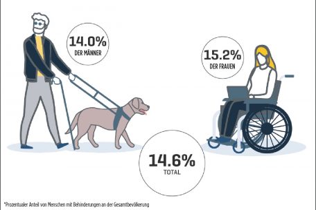 Sehr unterschiedlich präsentiert sich die Situation bei Frauen und Männern. Sind rund 15,2 Prozent der Frauen von einem solchen Umstand betroffen, sind es „lediglich“ 14 Prozent aller Männer. Der Unterschied erkläre sich dadurch, dass das Durchschnittsalter der Frauen auch höher sei als das der Männer und dass die Wahrscheinlichkeit, mit einer Behinderung leben zu müssen, auch mit dem Alter steigt. Liegt der Prozentsatz in der Gruppe der 15- bis 19-Jährigen bei knapp zehn Prozent, sind bei der Altersgruppe über 85 weit mehr als die Hälfte aller Personen. Bei den Kindern bis neun Jahren sind es weniger als fünf Prozent.