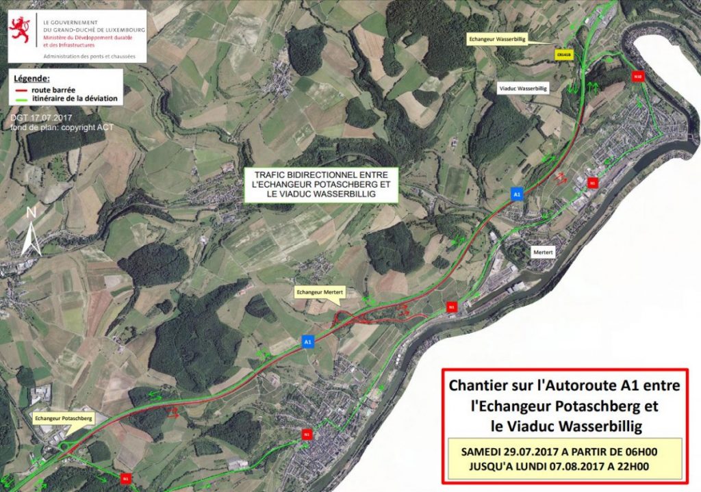 Die A1 in Richtung Trier ist von Samstagmorgen an ab Potaschberg komplett gesperrt. Das teilte die Straßenbauverwaltung mit. Bis zum 7. August werkeln die Straßenbauer an einem neuen Fahrbahnbelag. Die Umleitung führt ab Potschberg über die N1 nach Mertert. Am Grenzübergang Wasserbillig können die Autofahrer wieder auffahren. Ab 22 Uhr wird die Schnellstraße dann am Montag in einer Woche wieder befahrbar sein.