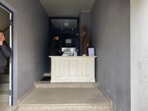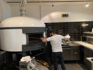 Als wir eintreten, ist sofort klar: Dieses Restaurant empfängt keine Gäste mehr. Die Stühle stehen auf den Tischen, auf den Sitzbänken stapeln sich die Pizzakartons, in einer Ecke wurde eine Playstation aufgestellt. Nichtsdestotrotz herrscht Betrieb. Der Koch bereitet den Ofen vor, ein Kellner ist hinter dem Tresen beschäftigt, ein anderer ist dabei, eine telefonische Bestellung aufzunehmen.