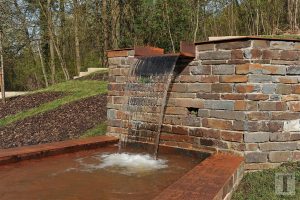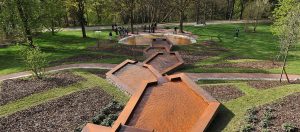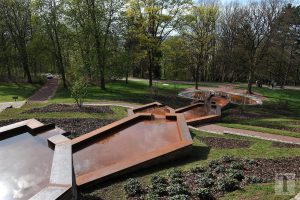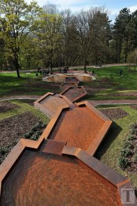 Die Mauern, die die Becken umrahmen, wurden aus „Grauwacke“ bebaut, einem Sedimentgestein aus den Norden des Landes. Die Becken selbst bestehen aus „Cortenstahl“. Dessen „rostige“ Farbe passe gut zu der „Grauwacke“, wurde gestern betont. Dazu kommt eine angepasste, „leichte“ Begrünung.