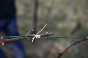 Die Reben werden gebogen und am Draht festgebunden, um eine optimale Verteilung der Triebe zu garantieren und die Stabilität der Rebe unter der Last der Trauben zu gewährleisten. Außerdem sorgt das Biegen dafür, dass weniger Seitentriebe wachsen. Dabei gibt es unterschiedliche Methoden, etwa den Flachbogen oder den Halbbogen. In unserer Rivaner-Parzelle haben wir den Flachbogen angewandt, das heißt, die Fruchtrute wird mit Weide oder Bindegarn am untersten Draht befestigt. Der Vorteil dieser Methode: ein gleichmäßiges Triebwachstum und eine schmale Zone, in der die Trauben später wachsen werden.