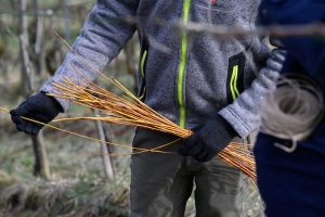 Selbstverständlich konnte aber niemand von uns mit Antonios Tempo mithalten. So wie er durch die Rebreihen marschiert, würde man niemals denken, dass er bereits 72 Jahre alt ist. „Die Arbeit im Weinberg hält ihn jung“, sagt Corinne Kox, die froh ist, dass Antonio ihrem Betrieb auch nach seiner Pensionierung noch erhalten geblieben ist. Er und Corinnes Vater Laurent haben früher ausschließlich mit Weiden gebunden. Dass die Domaine Kox heute noch auf Weiden zurückgreift, liegt daran, dass sie in ihrem eigenen Garten wachsen. „Es ist eine natürliche Ressource, deshalb nutzen wir sie auch heute noch zum Teil“, sagt Corinne. Allerdings benötigt die Vorbereitung der Weiden Zeit: Sie müssen geschnitten und in Wasser eingelegt werden.