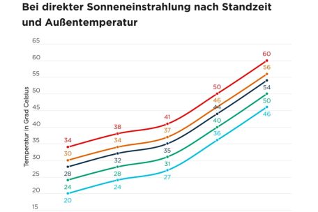 Autos können bei hohen Temperaturen sehr schnell zur Hitzefalle werden. Bei einer Außentemperatur von 34 Grad erhitzt sich ein Auto bei direkter Sonneneinstrahlung nach nur fünf Minuten auf 38 Grad. Nach zehn Minuten sind es bereits 41 Grad – und nach 30 Minuten 50 Grad. Vor allem Kinder kann das sehr schnell gefährlich werden. Auch Haustiere sind gefährdet. Aber: Auch für die Autofahrer selbst stellt die Hitze ein Sicherheitsrisiko dar.