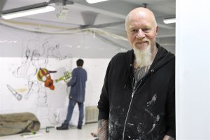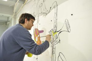 Am Montag waren die Wände der Lagerhalle noch weitestgehend leer. Fast alleine in dem großen Gebäude war Jim Peiffer (31) dabei, sein Kunstwerk zu verwirklichen. Seit seinem zwölften Lebensjahr interessiert er sich für Kunst. Das hat er auch in Brüssel studiert: „Ich zeichne viele Köpfe und Figuren und immer aus dem Kopf heraus“, erklärt er. Bei „Aal Esch“ hat er sich das Konzept einer Palme ausgedacht, die aus Köpfen besteht, die Musik machen. Dass seine Kunst nur für ein paar Wochen zu sehen sein wird, stört ihn nicht weiter. Das sei ja bekannt.