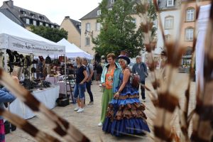 Sie stach sofort ins Auge, denn beim Betreten des Echternacher Marktplatzes konnte man den Stand von Marie Christiann-Vandewalle nicht verfehlen. Reihen um Reihen voller Hüte, Baretts, Tiaren und Broschen mit Federn, Bändern und Tüll erwarteten die Besucher der Steampunk-Convention, von denen sich zahlreiche in die fantasievollen Kreationen von „Esprit de Mélusine“ verliebten. Seit 15 Jahren arbeitet Christiann-Vandewalle als Modistin und Requisiteurin. Ursprünglich aus dem Norden von Frankreich, spezifisch dem Département du Pas-de-Calais, reist die Künstlerin durch ganz Europa, um bei Mittelaltermärkten, Fantasy-Festen und Conventions ihre Kreationen zu präsentieren.