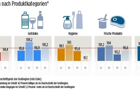 Im Vergleich der fünf untersuchten Produktkategorien zeigt sich ein ähnliches Bild. Deutlich billiger als in allen drei angrenzenden Regionen ist Luxemburg nur im Bereich Getränke, und das auch nur bei Getränken mit Alkohol. In den anderen vier Kategorien (Lebensmittel, Drogerie, frische Produkte und Nicht-Lebensmittel wie Batterien oder Glühbirnen) ist Einkaufen in Deutschland und Frankreich billiger. Nur Belgien ist, laut der Studie, in jedem untersuchten Bereich teurer als Luxemburg.
