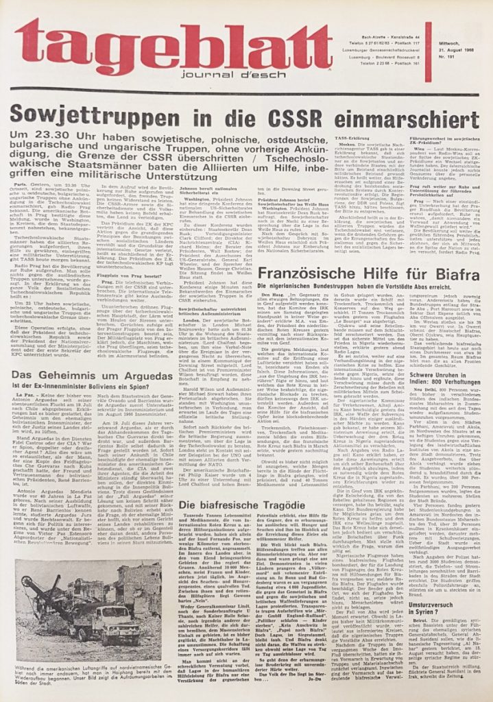 Einen Augenzeugenbericht der besonderen Art gab es für die Tageblatt-Leser am 24. August 1968. Die Escher Familie Weber hatte in Prag den Einmarsch der sowjetischen Truppen mit verfolgen können – sie machte gerade Urlaub dort. Probleme bei der Ausreise hat die Familie keine bekommen, sie sei, so wird berichtet, von den Soldaten der Länder des Warschauer Paktes stets freundlich behandelt worden, wie es auch eine Anweisung aus Moskau vorgeschrieben hatte.